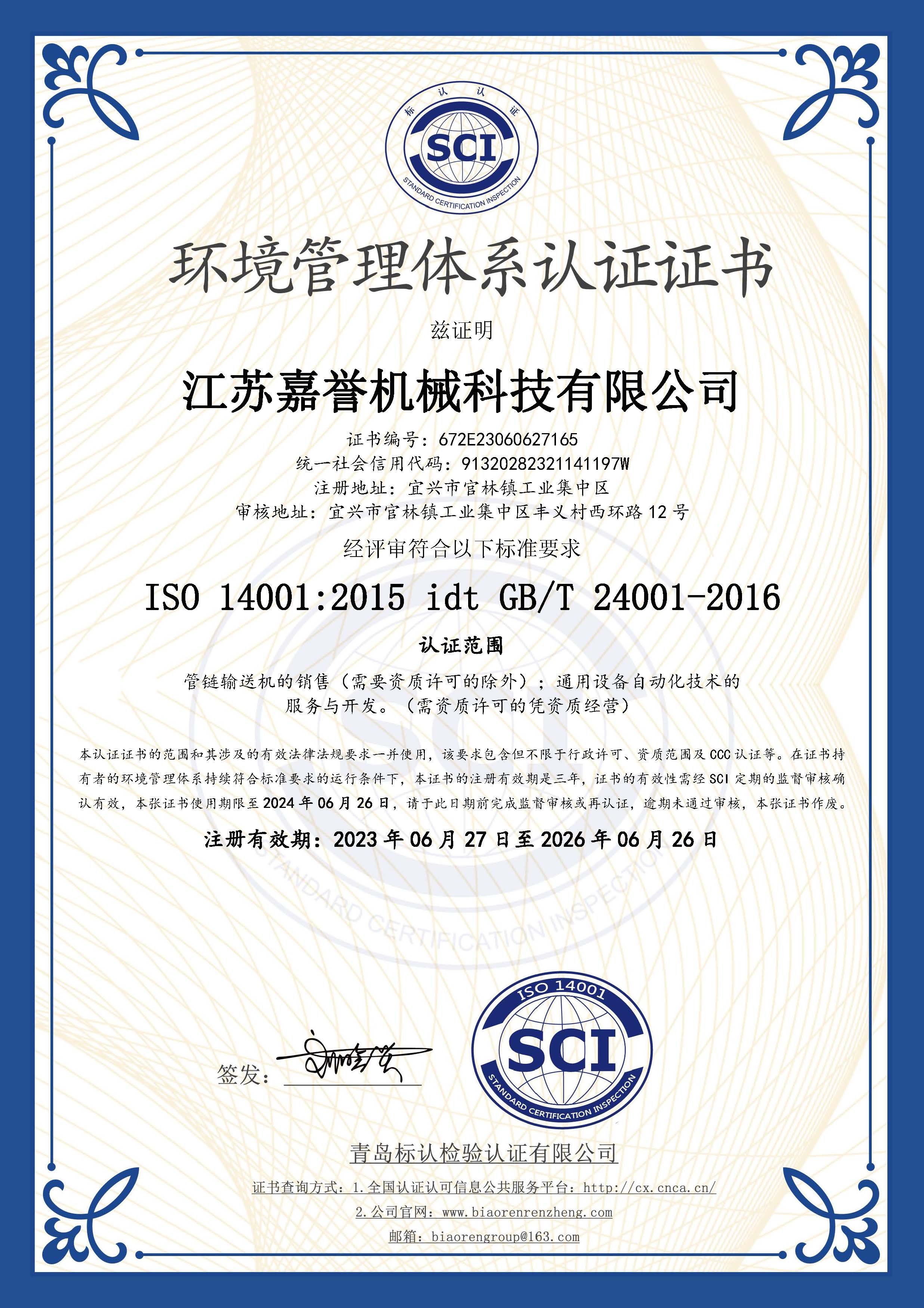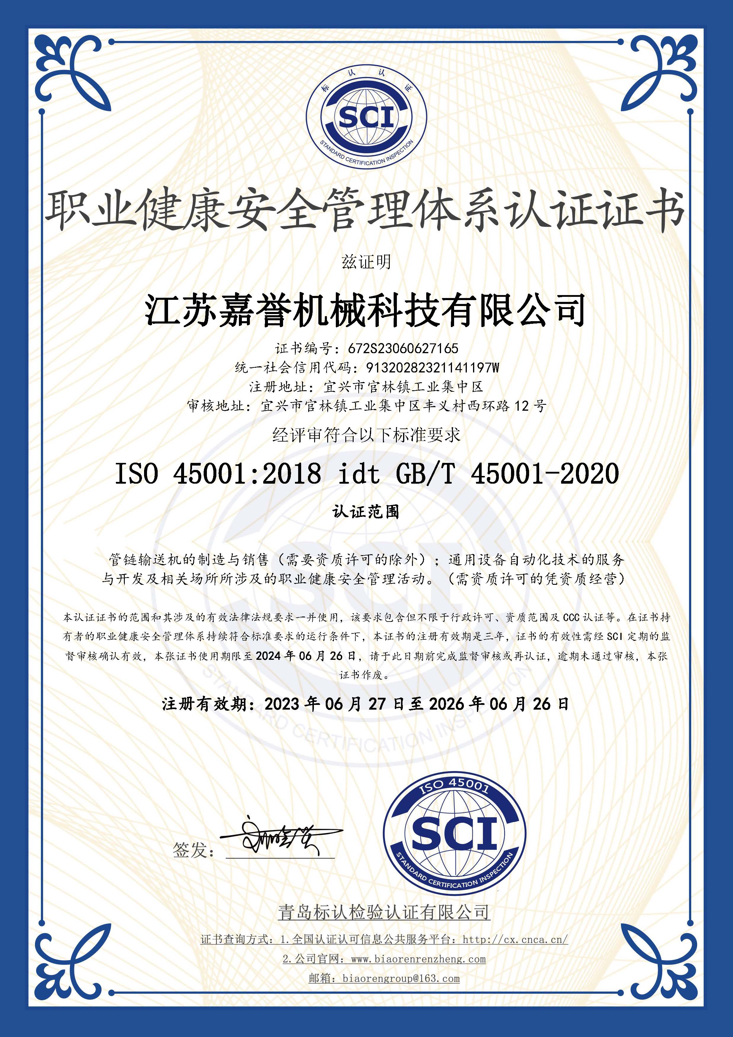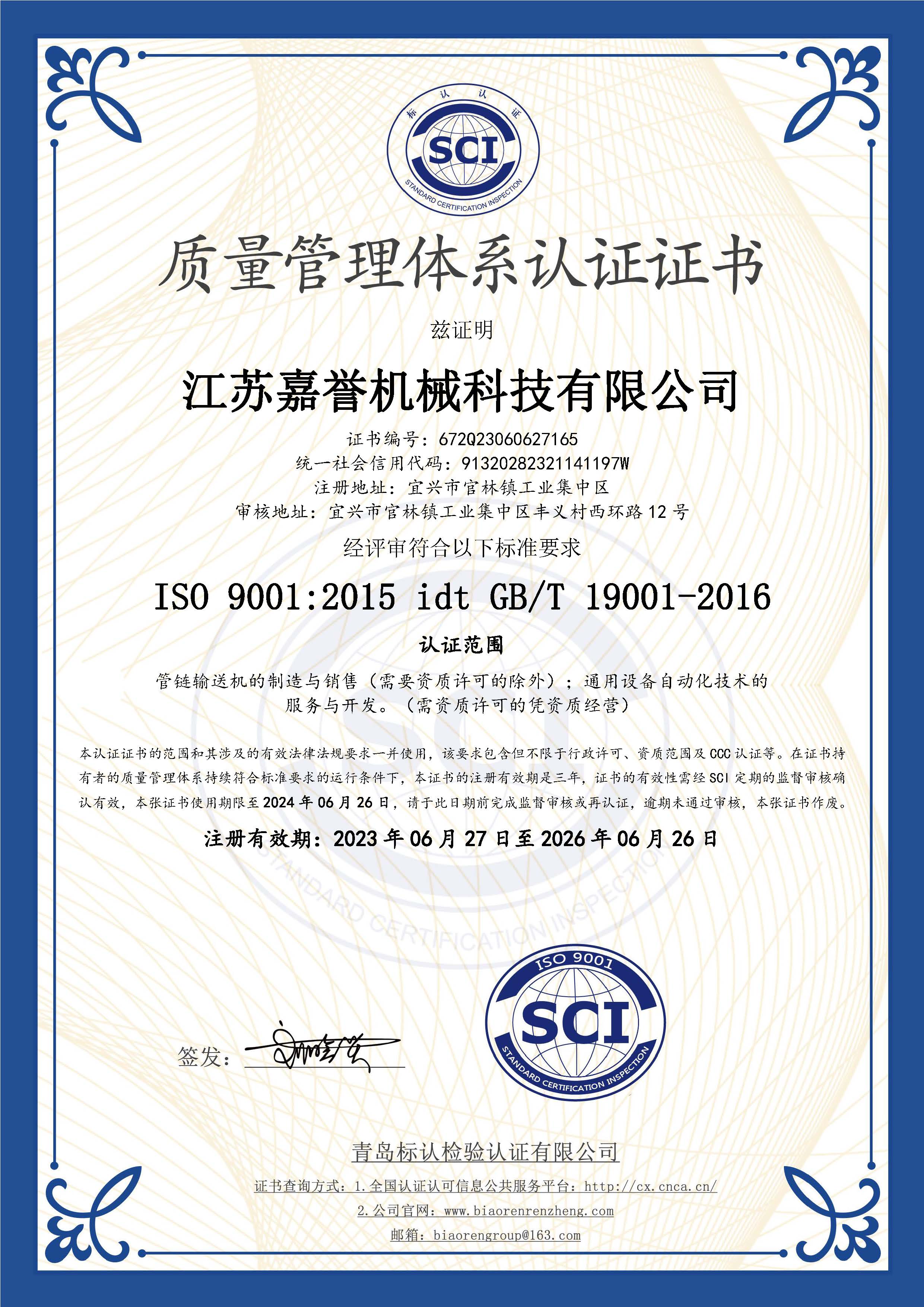 The company has passed the ISO 9001:2008 quality management system certification, 14000 environmental system certification; the company mainly produces pipe chain conveyor, applicable to the plastic industry, fine chemicals, mining, building materials and food industry and other fields; equipment sold well with more than 20 provinces, municipalities and autonomous regions in the country; well received by users.